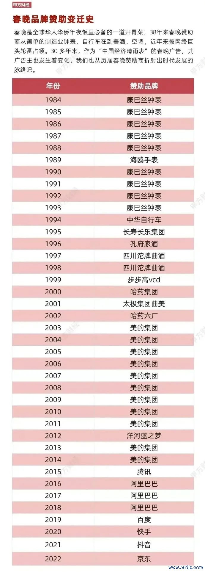 从1984年康巴丝钟表行动首个春晚告白扶持商起,接着是秦池酒业、孔府宴酒、哈药六厂到中国出动、阿里巴巴等互联网巨头……
