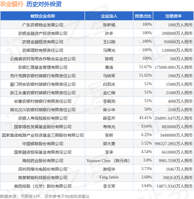 本站音问,阐发天眼查APP败露,农业银行(601288.SH)新增一谈对外投资事件,被投资公司为光正眼科病院集团股份有限公司开云kaiyun.com,法定代表东谈主周永麟,投资占比为1.23%。该公司从事卫生,注册成本为51846.7074万东谈主民币。现在,农业银行共存在对外投资646项,投资占比前20的形式见下表: