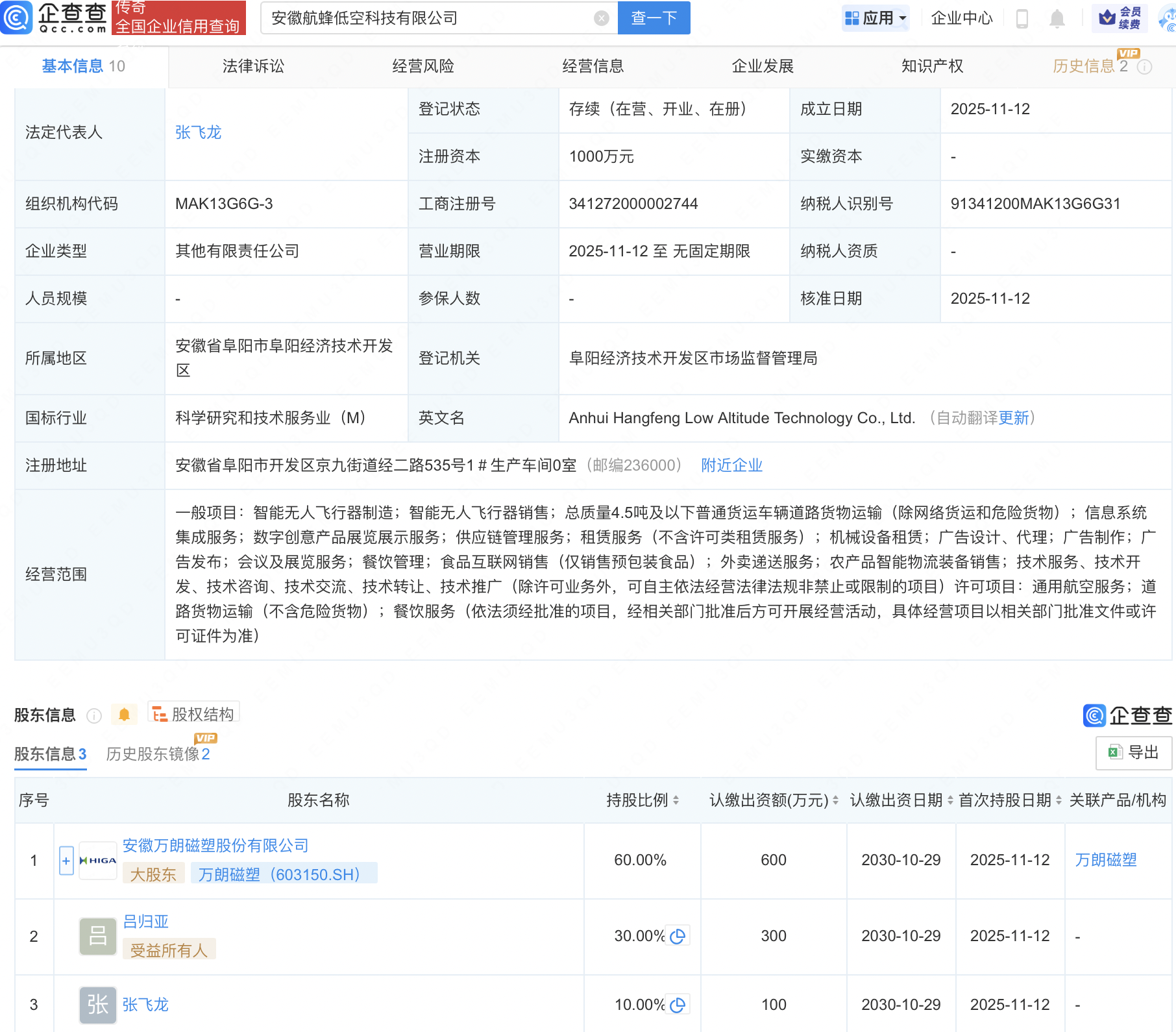 近日,安徽航蜂低空科技有限公司修复开云(中国)开云kaiyun官方网站,注册成本1000万元,酌量鸿沟包含:智能无东说念主飞翔器制造;智能无东说念主飞翔器销售;信息系统集成劳动;数字创意家具展览展示劳动等。企查查股权穿透知道,该公司由万朗磁塑(603150)等共同握股。